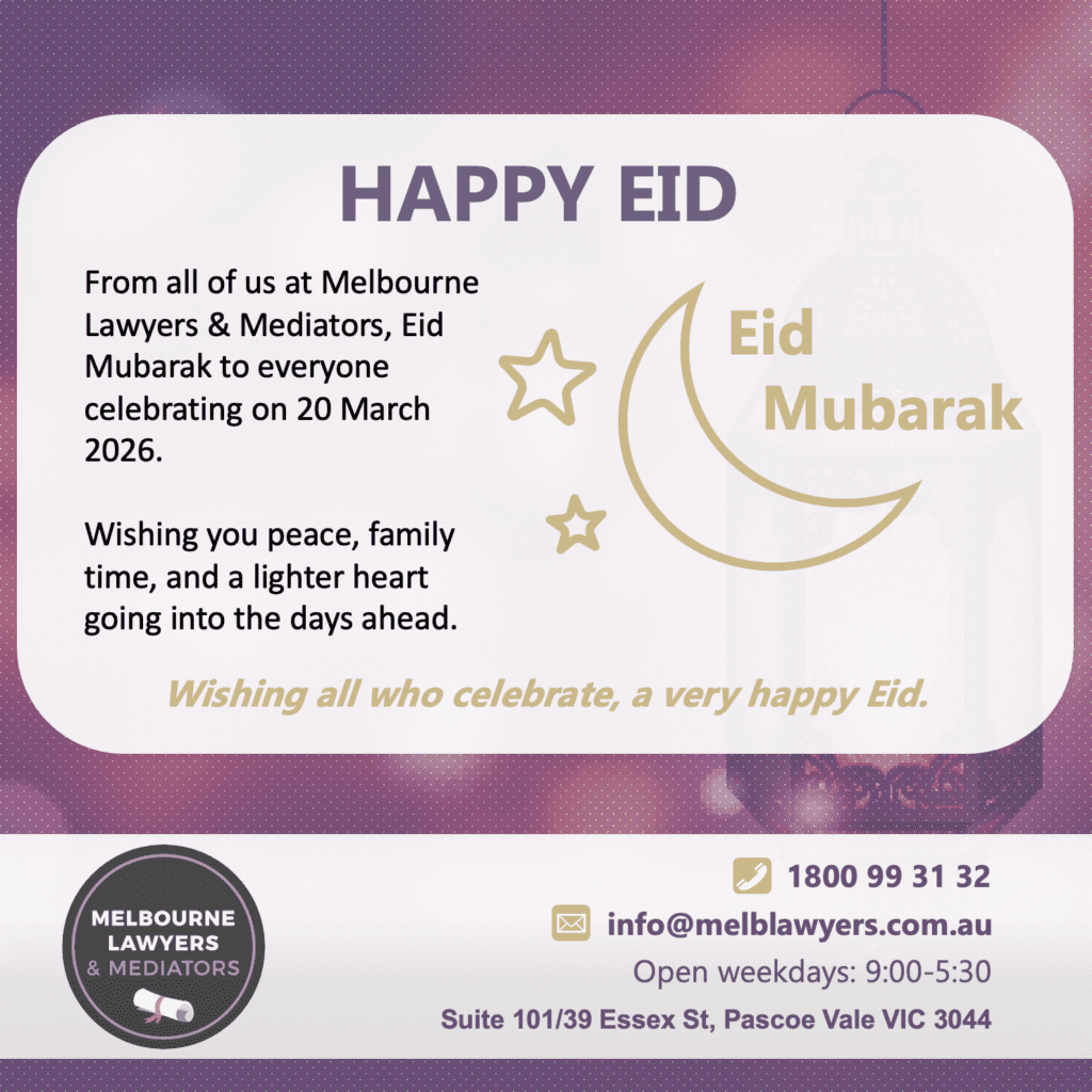 From all of us at Melbourne Lawyers & Mediators, Eid Mubarak to everyone celebrating on 20 March 2026.